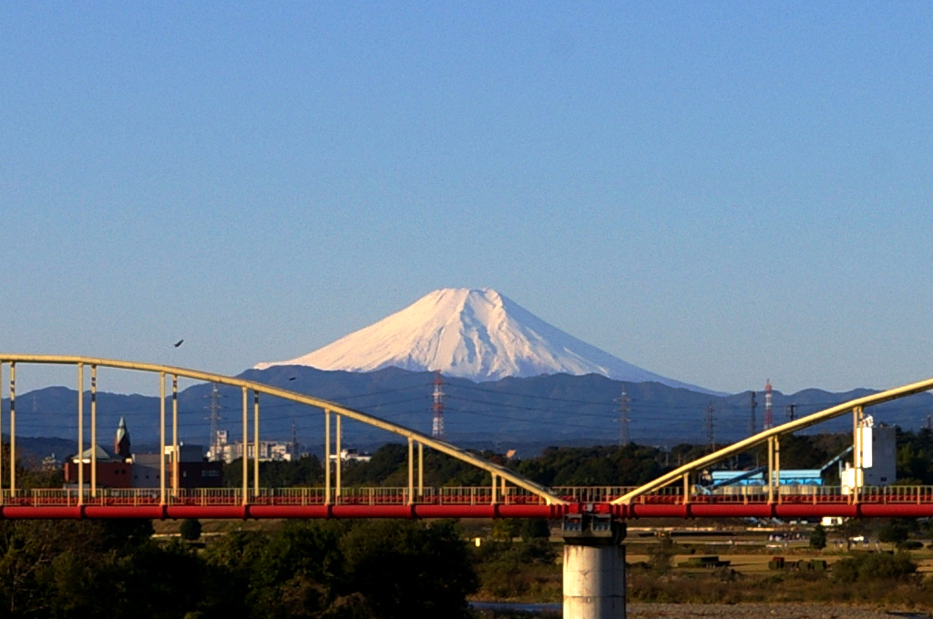 近所の橋の上から富士山が見えます。