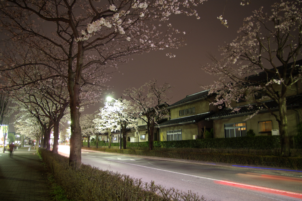 桜が道路の両側と、歩道の外側にあります。